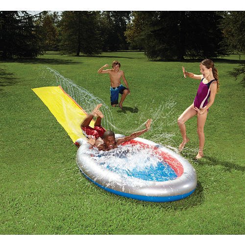 The Monster Splash Slip 'n Slide lawn water slide has a ramp at the end of the Slip 'n Slide that launches the rider into an inflatable kiddie pool for big splash fun.